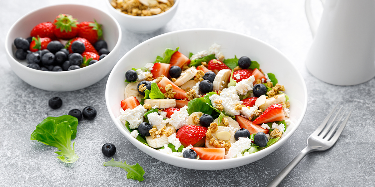 - リーフレタス、バナナ、イチゴ、ブルーベリー、クルミ、カッテージチーズを盛り付け、ドレッシングをかけて完成。